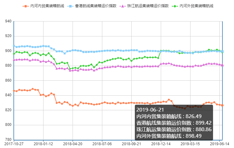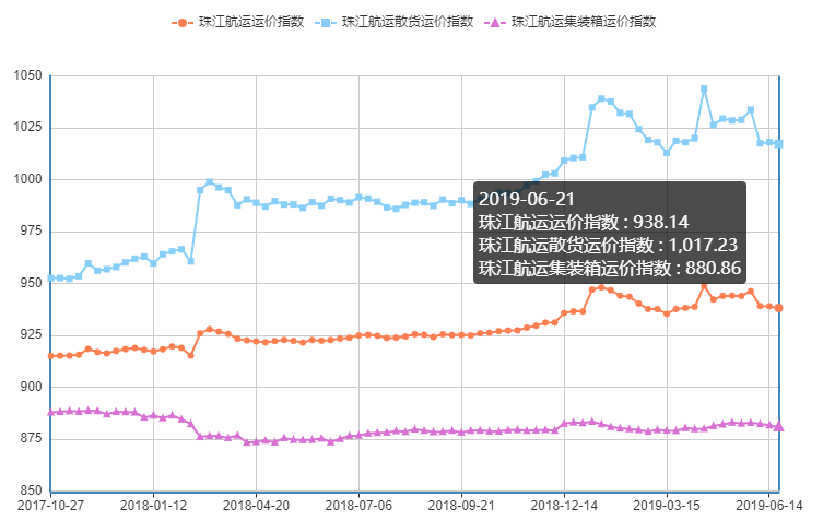 2019年6月21日,广州航运交易所发布的珠江航运综合运价指数有所回落,报收938.14点,较上个报价期下降0.85点。本期珠江航运集装箱运价指数报收880.86点,较上期下降0.87点;珠江航运散货指数报收1018.06点,较上期下降0.83点。