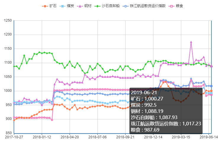 2019年6月21日,广州航运交易所发布的珠江航运散货运价指数报收1018.06点,较上期下降0.83点。本周粮食市场供求较为平衡;钢材方面,因顺德水道封航,进出乐从作业的船舶需要排队等待放行,本期黄埔-乐从航线运价下跌1元/吨;南方进入大面积炎热的天气,用电量持续攀升,煤炭市场成交活跃,南沙-佛山、珠海-佛山、虎门-佛山、黄埔-贵港、南沙-江门等航线运价较上期下跌0.5-1元/吨,珠海-佛山、黄埔-贵港、黄埔-清远、珠海-贵港、虎门-佛山、虎门-清远航线运价上涨0.5-2元/吨;矿石市场方面,本期广西仍受强降水天气影响,贵港-南沙航线运价较上期上涨0.5-3元/吨;英德-南沙航线运价下降1元/吨;沙石自卸船方面,本期清远-南沙航线运价下降1元/吨。