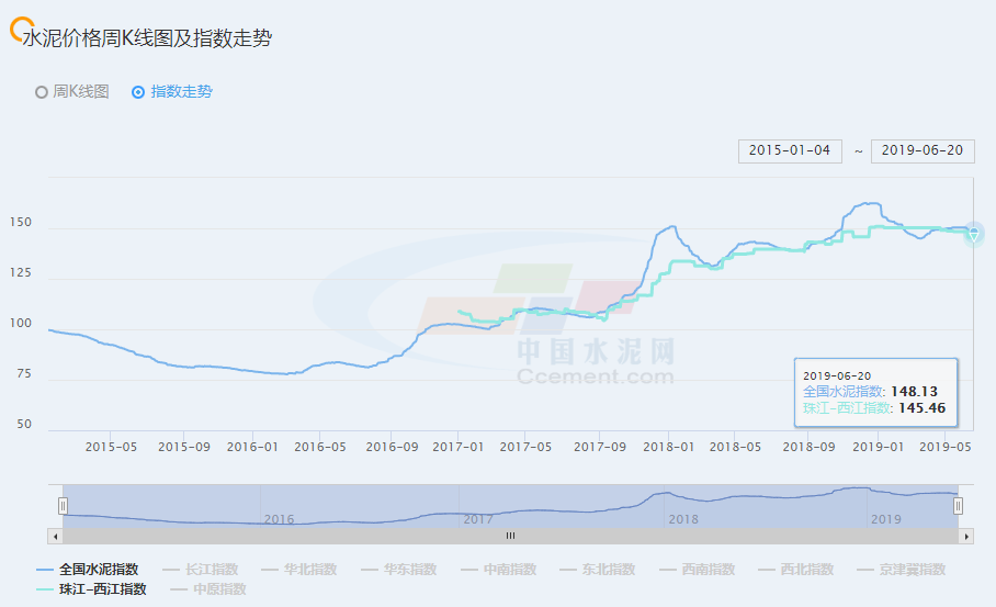 全国水泥价格指数(CEMPI)报收148.13点,同比上涨3.93%,环比下跌0.33%。长江水泥价格指数(YRCPI)报收154.28点,同比上涨5.14%,环比下跌0.96%。全国熟料价格指数(CLKPI)报收144.55点,同比上涨3.69%,环比无变化。六月以来,各地雨水增多,气温上升加之高考、端午小长假等因素影响,市场需求较弱,全国水泥价格整体呈现下滑势头。中国水泥网行情数据中心消息显示,5月中下旬以来广西河池市场多数企业普遍下调各品种水泥价格20元/吨,6月中旬其余厂家水泥价格跟进下调。玉林地区受强降雨影响,市场需求下滑,部分厂家库满停窑于6月上旬对散装水泥价格下调10-20元/吨。广东方面,5月中下旬珠三角及周边粤北地区一些企业陆续下调水泥价格10-20元/吨,进入6月局部仍有降雨影响,市场行情趋弱运行。华南市场本周水泥行情受到雨水天气影响,保持下行走势,水泥价格难以保持。