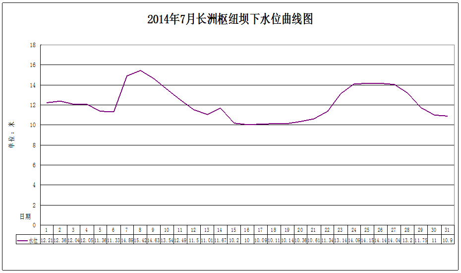 (三)7月1日至7月31日,长洲枢纽坝下最高水位为15.42m,最低水位为10m,平均水位为12.12m,比最低通航水位高7.57m,同比增长59%,环比增长0.7%。