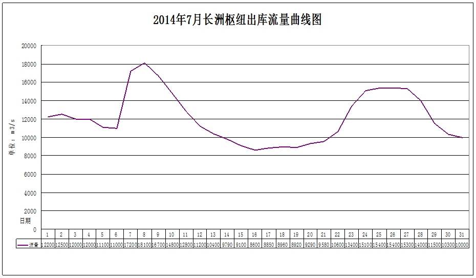 (一)本月受强对流天气和台风等因素影响,珠江流域曾出现两次较大范围降雨,每次降雨量均超过100mm,局部地区超过300mm。当月长洲枢纽最大出库流量为18100 m3/s,最小出库流量为8600 m3/s,平均出库流量为12132m3/s,同比增长126%,环比下降3%。7月4日至6日,广西壮族自治区百色、河池、南宁、桂林等地出现强降雨,6日至8日,长洲枢纽出库流量由11000 m3/s急剧上升至18100 m3/s,之后开始缓慢持续下降,至16日下降至8600 m3/s;7月22日至26日,受台风影响,长洲枢纽出库流量由10600 m3/s上升至15400 m3/s后再次下降,两次陡涨陡落对船闸运行产生了一定影响。