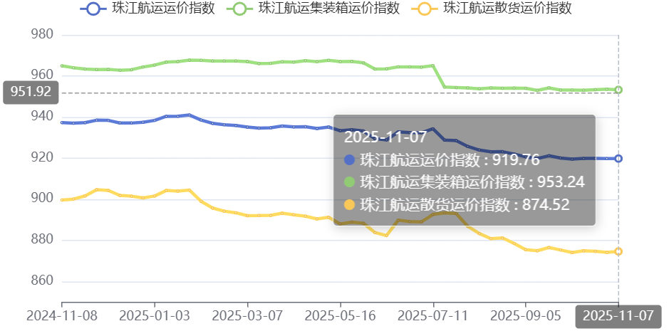 2025年11月7日,广州航运交易所发布的珠江航运综合运价指数报收919.76,较上期上涨0.03点。本期珠江航运集装箱运价指数报收953.24点,较上期下跌0.32点;珠江航运散货运价指数报收874.52点,较上期上涨0.46点。