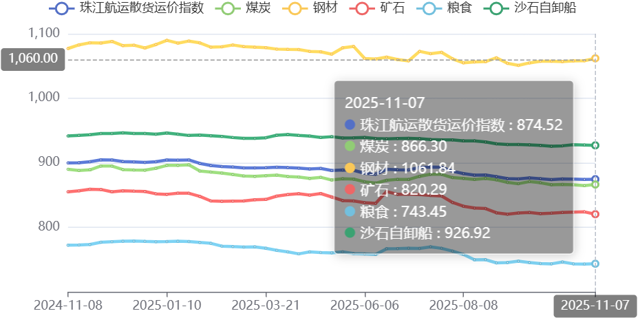 2025年11月7日,广州航运交易所发布的珠江航运散货运价指数报收874.52点,较上期上涨0.46点。