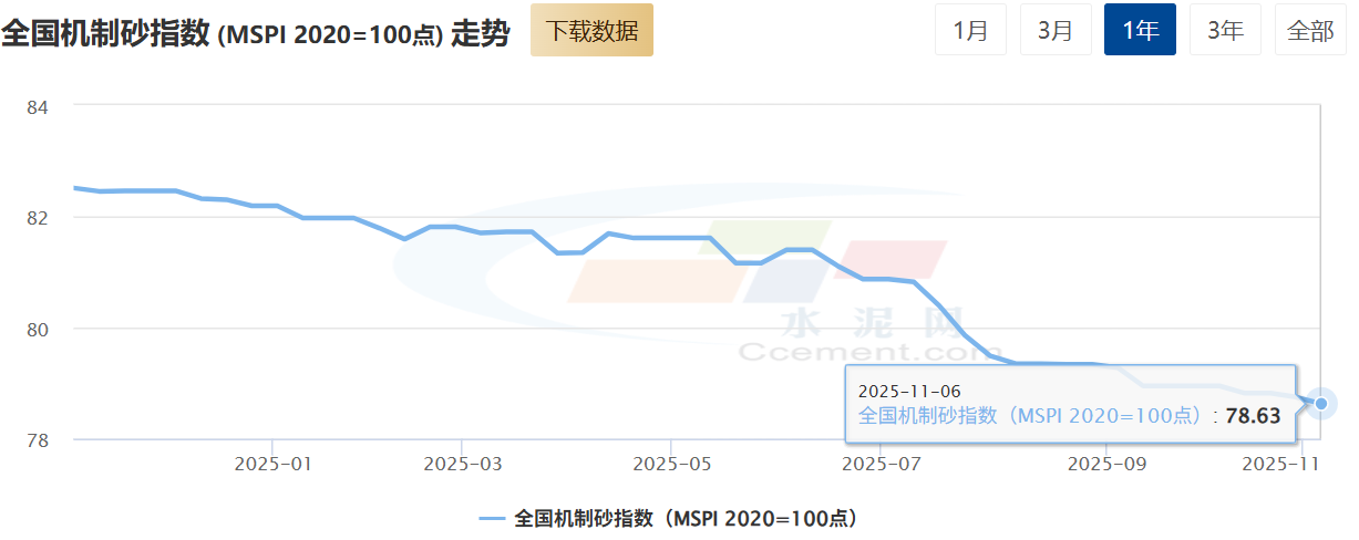 砂石需求持续收缩,价格小幅下跌。全国机制砂价格指数(MSPI)报收78.63点,环比下跌0.15%,同比下跌4.7%。据百年建筑网统计,截至11月5日,本周广东砂石均价95.11元/吨,周环比下降0.67%。