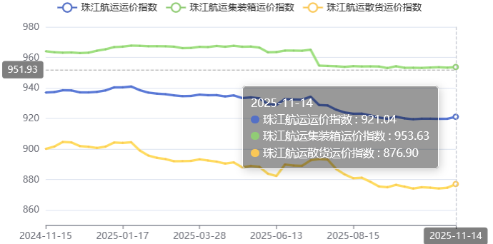 2025年11月14日,广州航运交易所发布的珠江航运集装箱运价指数报收953.63点,较上期上涨0.4点。