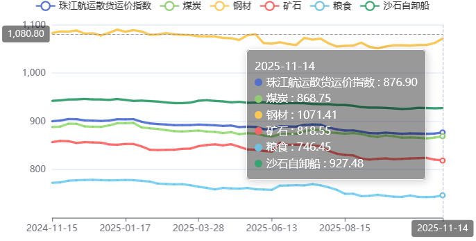 2025年11月14日,广州航运交易所发布的珠江航运散货运价指数报收876.9点,较上期上涨2.39点。