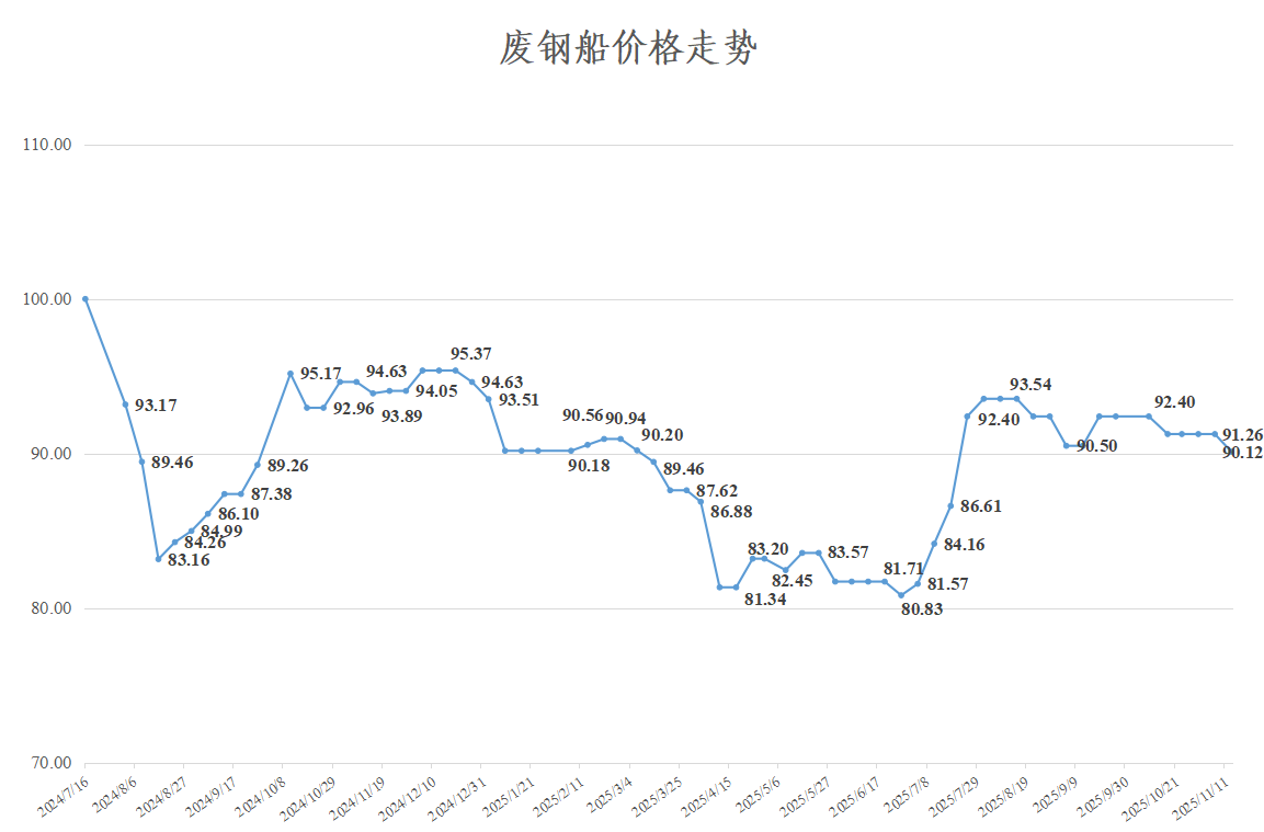 本期废钢船偏弱运行,环比下降1.25%,同比下降4.02%。本期黑色期货震荡分化,螺纹钢价格先抑后扬。钢厂生产积极性受挫,电弧炉钢厂持续亏损。废钢供需双弱凸显,价格走弱,市场情绪较谨慎。其中,内河废钢船价走势环比下降1.22%,同比下降4.13%;沿海废钢船价走势环比下降1.33%,同比下降3.65%。