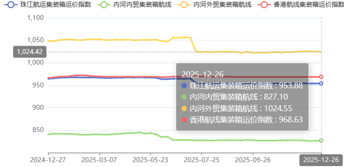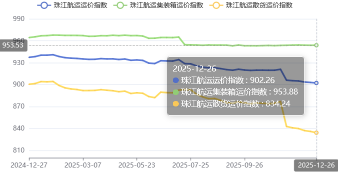 2025年12月26日,广州航运交易所发布的珠江航运综合运价指数报收902.26,较上期下跌0.78点。本期珠江航运集装箱运价指数报收953.88点,较上期上涨0.07点;珠江航运散货运价指数报收834.24点,较上期下跌1.81点。