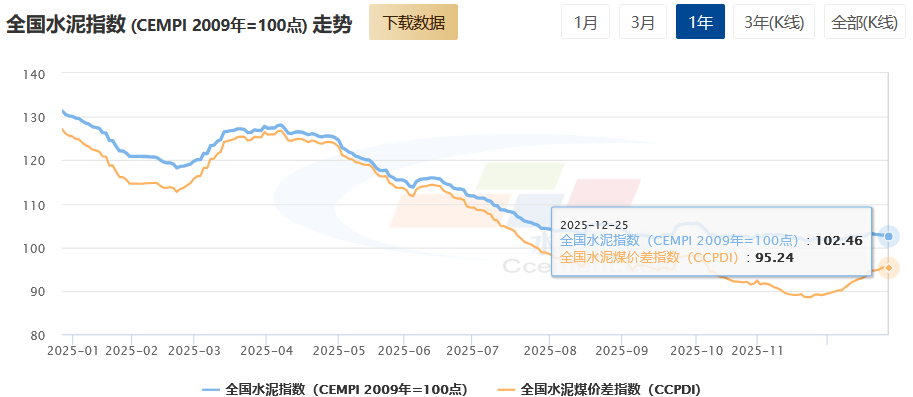 水泥行情总体平稳,全国水泥价格指数(CEMPI)报收102.46点,日环比下跌0.28%,同比下跌22.06%。