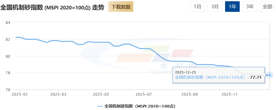 全国机制砂价格指数(MSPI)报收77.71点,连续四周平稳运行,同比下跌5.6%。