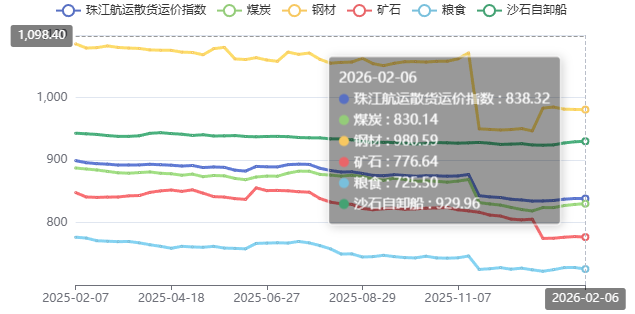 2026年2月6日,广州航运交易所发布的珠江航运散货运价指数报收838.32点,较上期下跌0.09点。