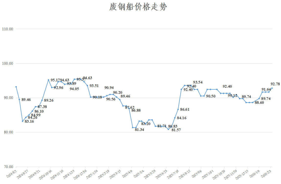本期废钢船偏强运行,环比增长1.25%,同比增长2.45%。本周黑色期货窄幅震荡,螺纹钢价格偏弱运行。临近春节假期,废钢市场供应呈现阶段性收缩,社会资源流动偏紧,对废钢船价格形成了支撑。其中,内河废钢船价走势环比增长1.21%,同比增长2.50%;沿海废钢船价走势环比增长1.33%,同比增长3.96%。