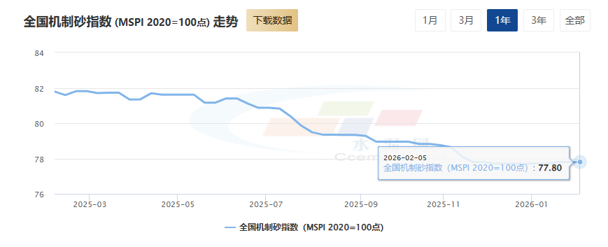 砂石市场,产能过剩,价格下跌,竞争激烈。全国机制砂价格指数(MSPI)报收77.80点,同比下跌4.88%。