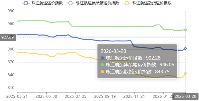 2026年3月20日,广州航运交易所发布的珠江航运综合运价指数报收902.28,较上期上涨5.26点。本期珠江航运集装箱运价指数报收946.06点,较上期上涨0.99点;珠江航运散货运价指数报收843.75点,较上期上涨10.43点。
