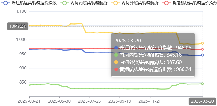 2026年3月20日,广州航运交易所发布的珠江航运集装箱运价指数报收报收946.06点,较上期上涨0.99点。