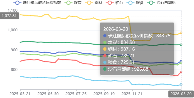 2026年3月20日,广州航运交易所发布的珠江航运散货运价指数报收843.75点,较上期上涨10.43点。