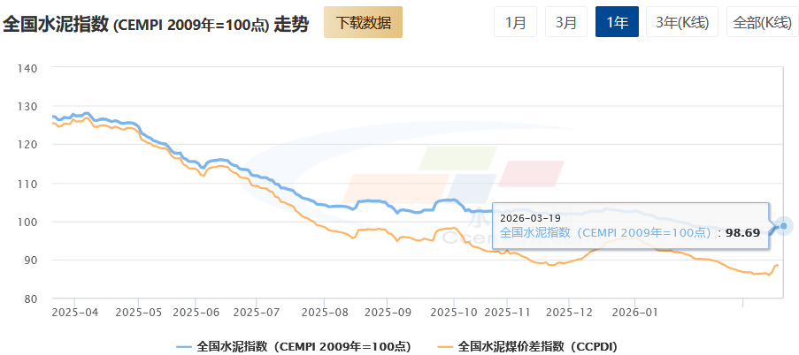 3-4月为传统施工旺季,水泥需求逐步回升,全国多地水泥企业出台调价政策形成联动效应。本周水泥价格持续上涨,行业筑底回暖。全国水泥价格指数(CEMPI)报收98.69点,日环比上涨0.12%,同比下跌22.4%。