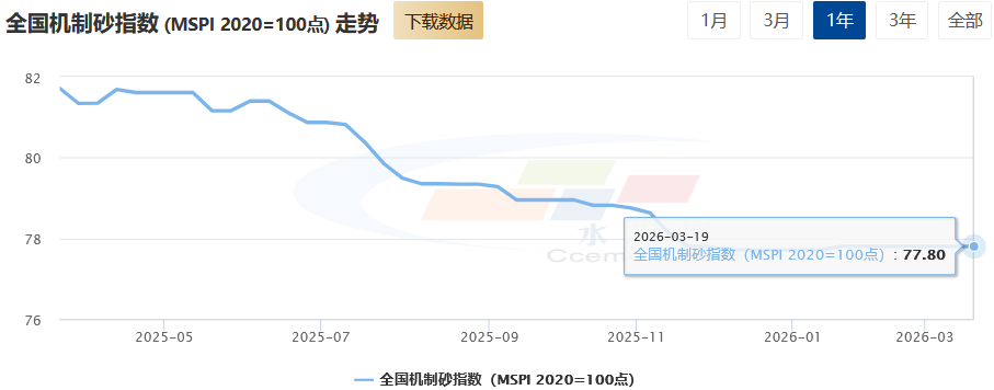 砂石价格保持平稳运行态势。全国机制砂价格指数(MSPI)报收77.80点,同比下跌4.8%。